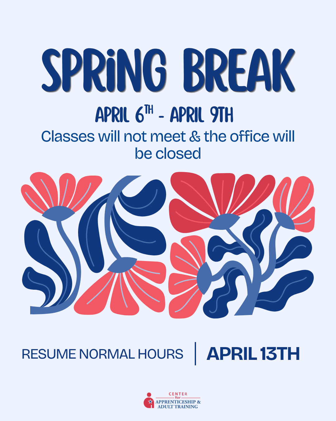 The Center for Apprenticeship & Adult Training offers classes year round both online or in person. View all of our programs by visiting our course catalog page to learn about how you can level up your career. Need help? Call our staff at 757-766-1101.