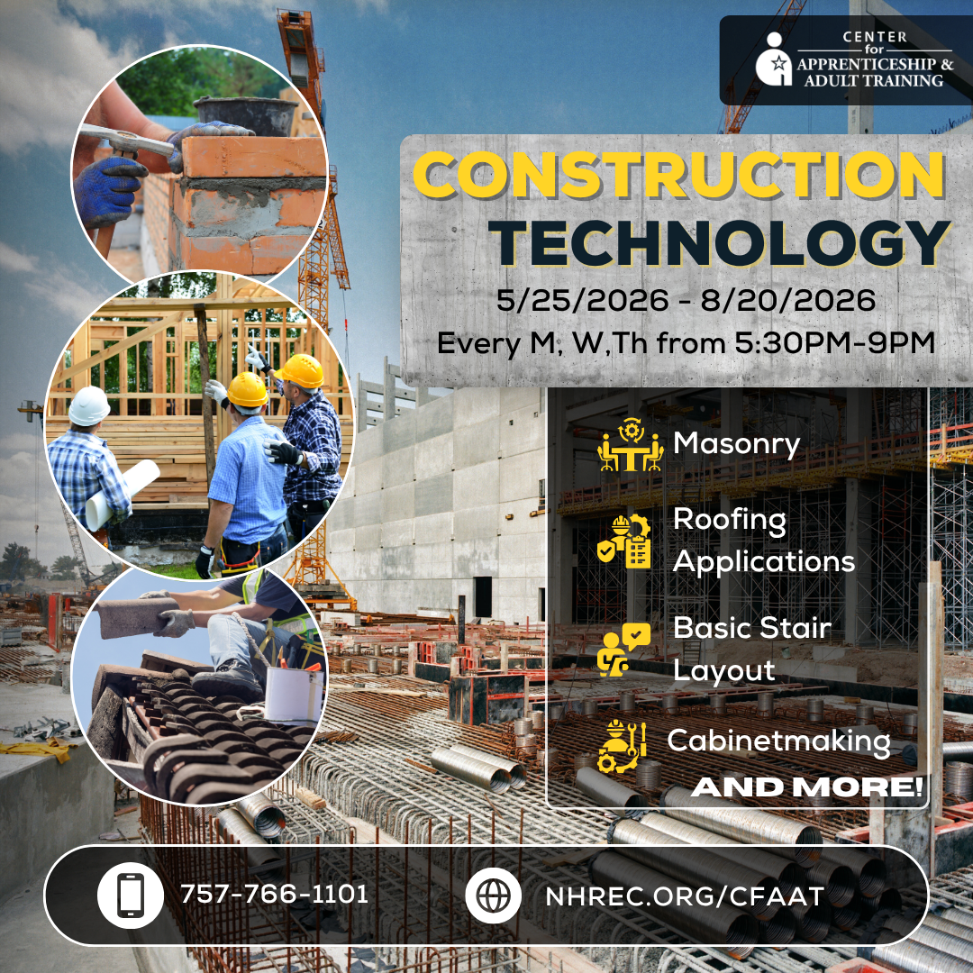 The Center for Apprenticeship & Adult Training offers classes year round both online or in person. View all of our programs by visiting our course catalog page to learn about how you can level up your career. Need help? Call our staff at 757-766-1101.