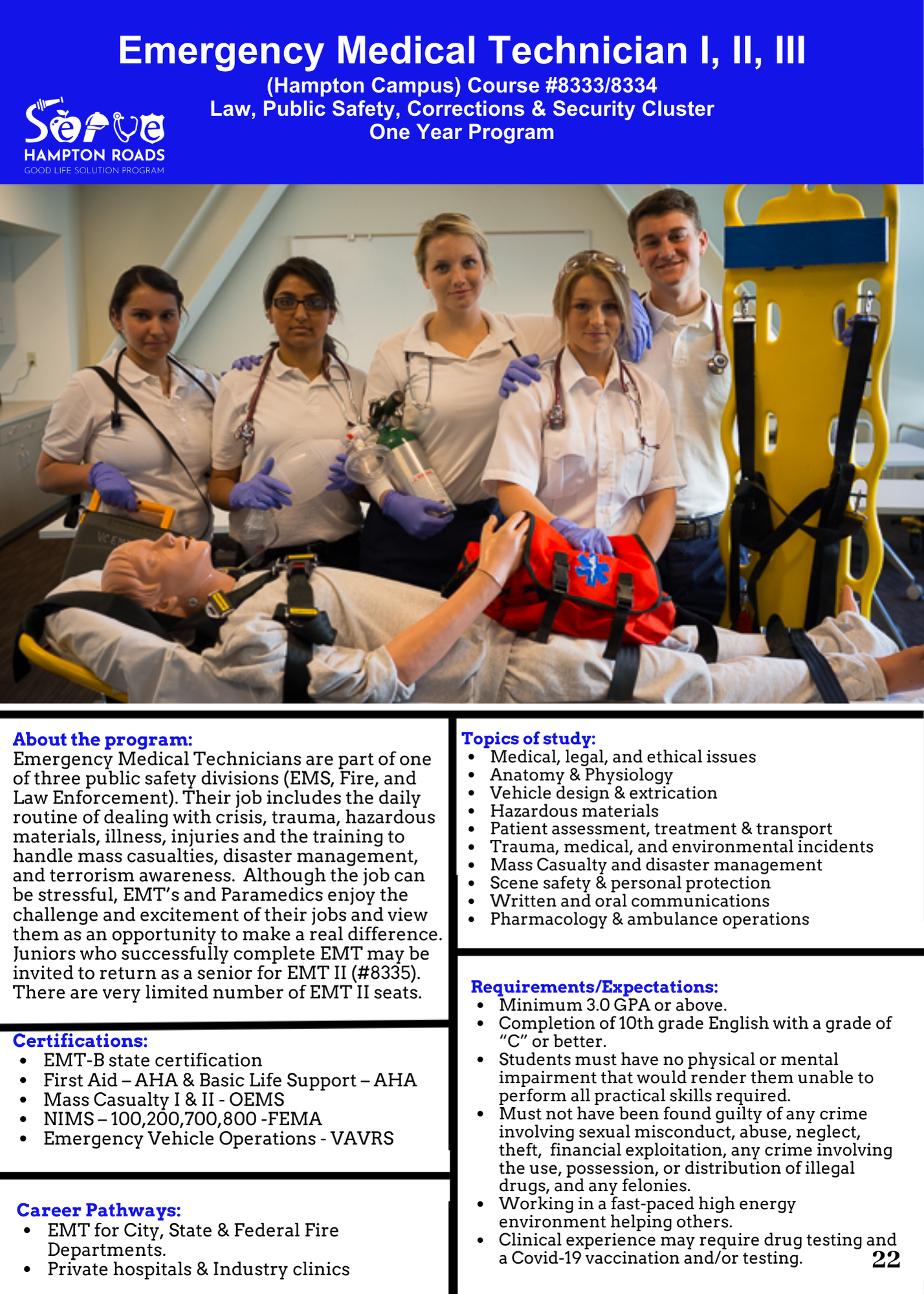 Campus Location: Butler Farm, Hampton Sessions: AM and PM Class Size: 20 students Credentials: EMT-B Virginia State Certification First Aid – AHA Basic Life Support – AHA Mass Casualty I & II – OEMS NIMS 100, 200, 700, 800 – FEMA Emergency Vehicle Operations Course – VAVRS