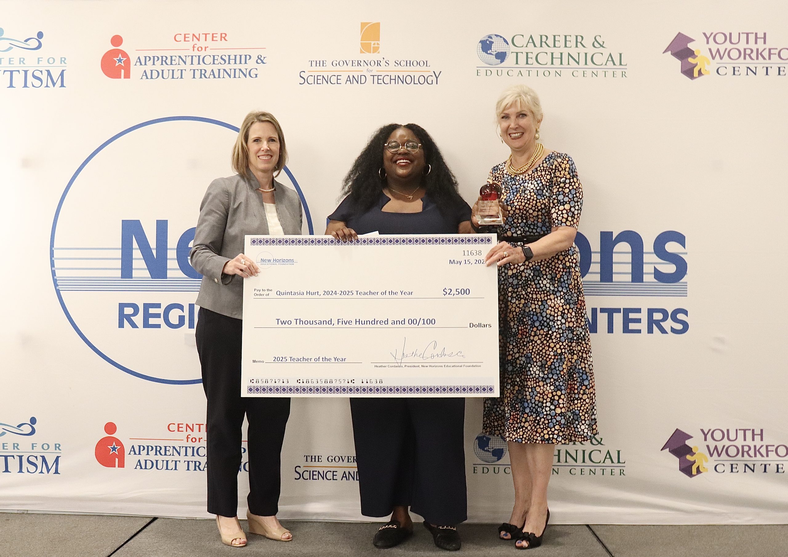 A heartfelt “thank you” is extended to the New Horizons Educational Foundation for sponsoring the annual event for the deserving educators serving at New Horizons. Please join us in celebrating the 2025 NHREC Teacher of the Year, Mrs. Quintasia Brown, from the Career and Technical Edcation Program at the Butler Farm Campus and all of the 2025 Program Teachers of the Year!